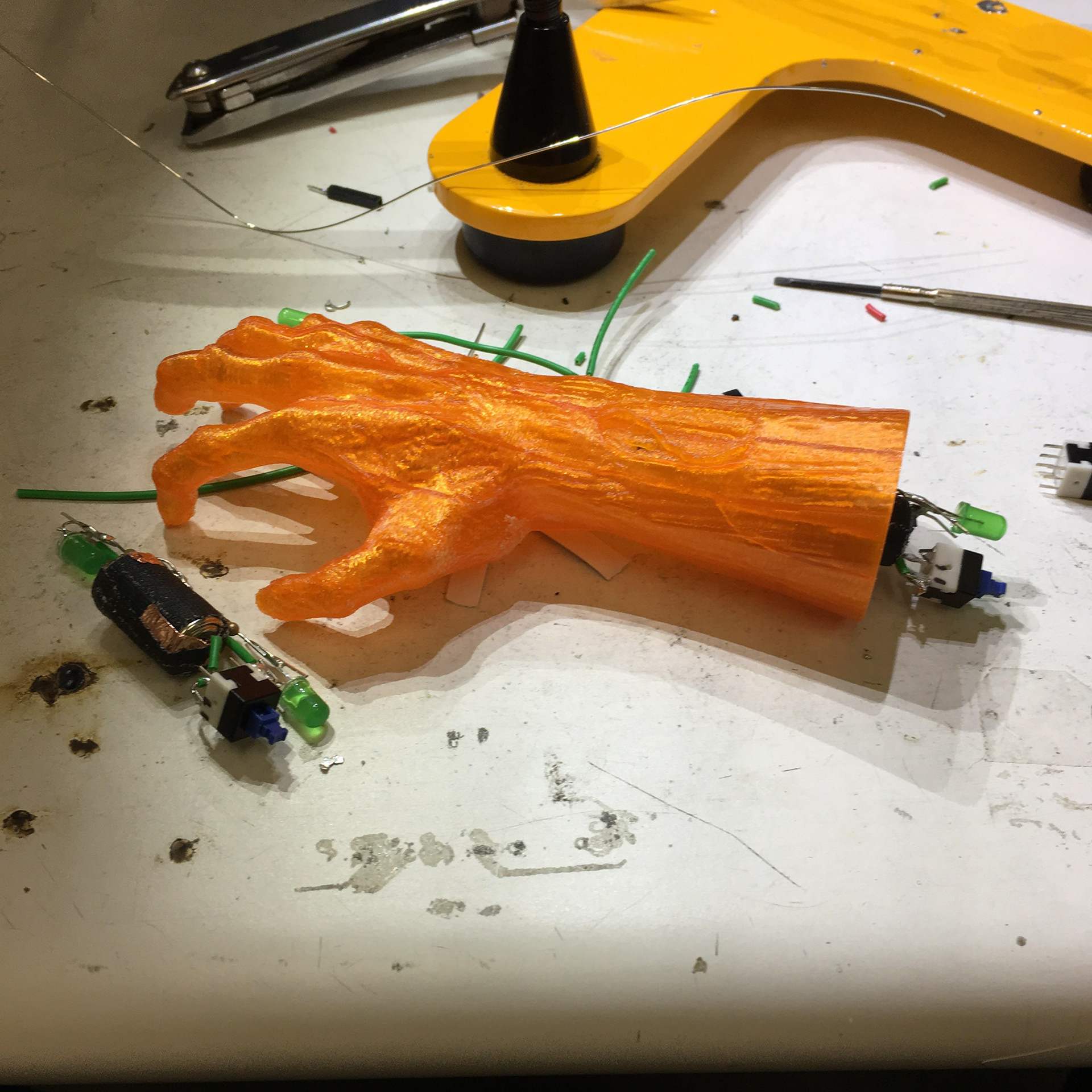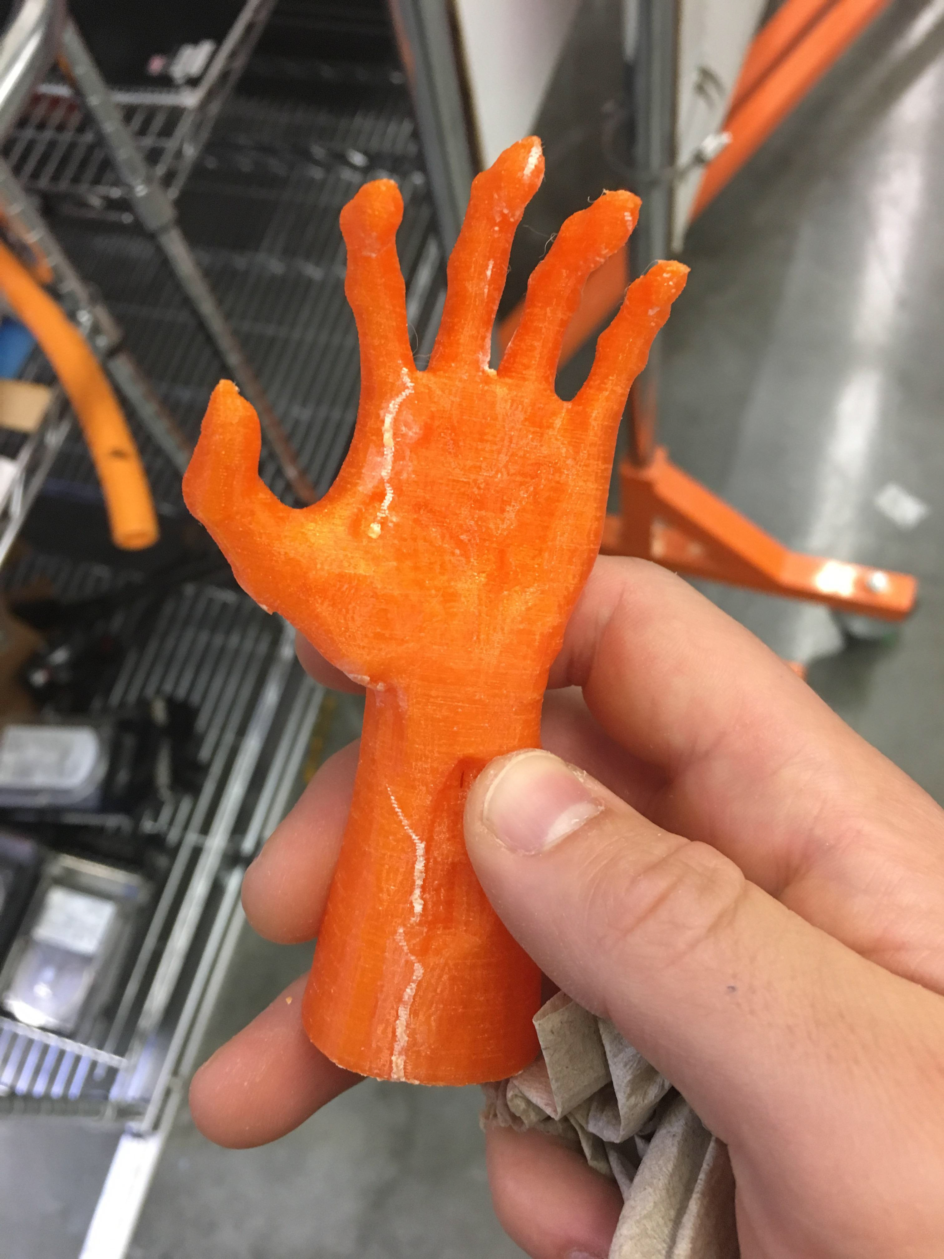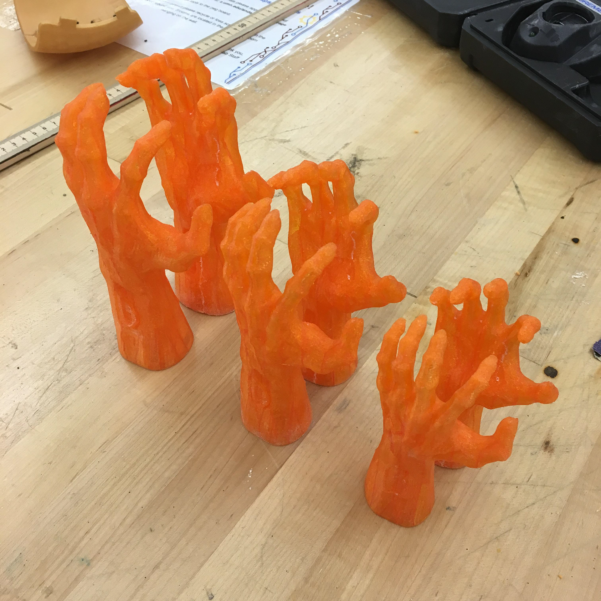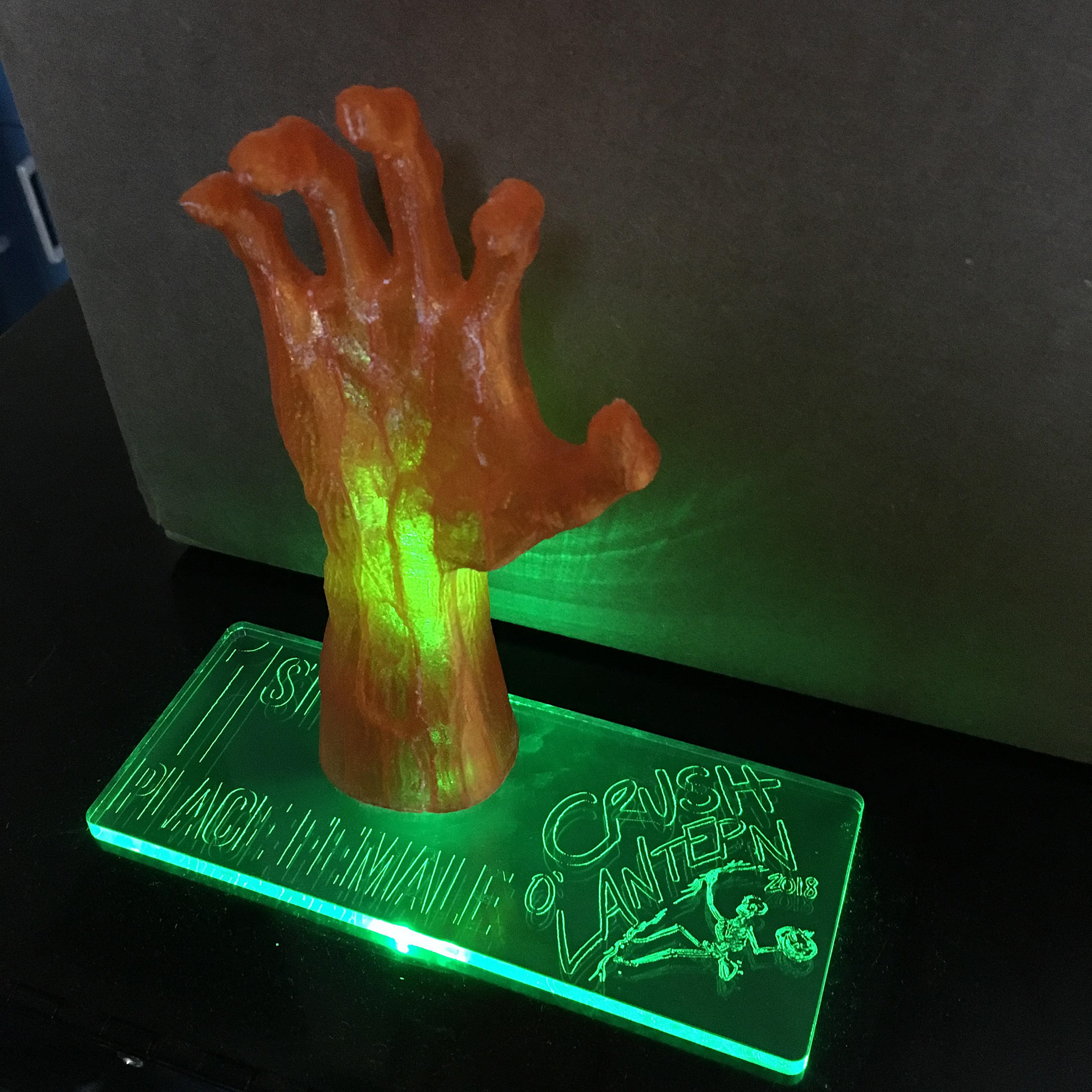 LEDs illuminate ABS 3D-printed zombie hands (found on Thingiverse). Laser cut and engraved acrylic forms the bases.